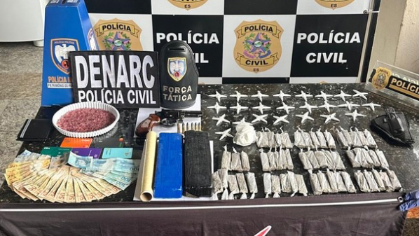 Durante as buscas, os policiais apreenderam uma arma de fogo calibre .38 com seis munições, aproximadamente 1,2 kg de maconha divididos em tabletes, tiras, buchas e porções, além de 95 pinos e uma porção de cocaína, uma substância cristalizada não identificada, embalagens para droga, uma motocicleta, celulares, dinheiro em espécie e outros materiais.