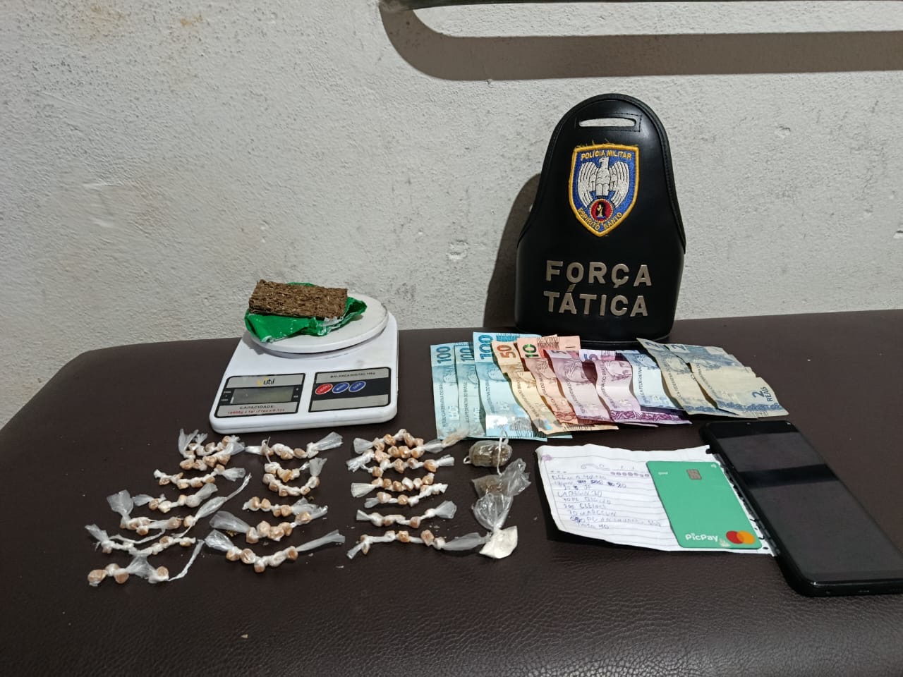 Na busca, os policiais localizaram 99 pedras de crack, um pedaço de maconha pesando 29 gramas, duas buchas da mesma droga, um papelote de cocaína, uma balança de precisão, um celular, uma folha com anotações, um cartão bancário e R$ 376,00 em dinheiro.