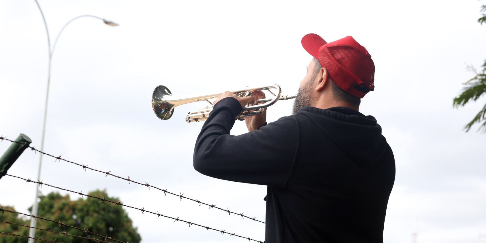 Logo cedo, o músico Fabiano Trompetista foi ao local para tocar a marcha fúnebre, em alusão à prisão de Bolsonaro.