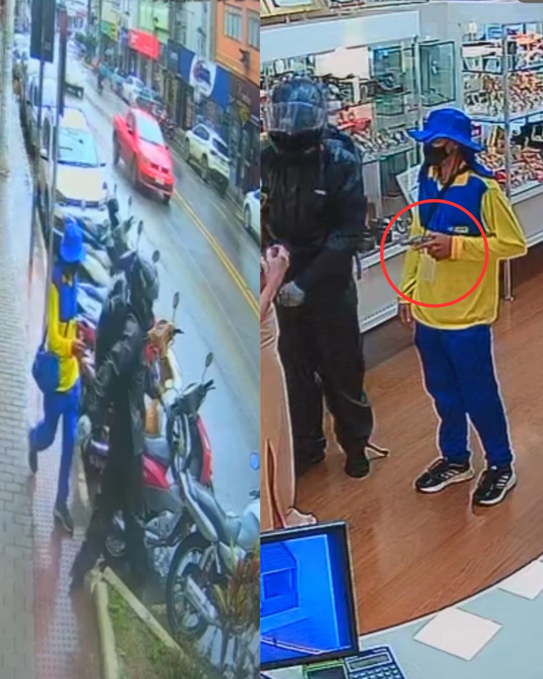 As imagens mostram que o suspeito de capa de chuva, que entrou na loja usando capacete, pilotava a motocicleta deixada em frente ao comércio. Elas também mostram o homem vestido com roupas semelhantes às dos Correios atravessando a rua e entrando na loja com o rosto coberto, como se estivesse aguardando o momento exato para agir.