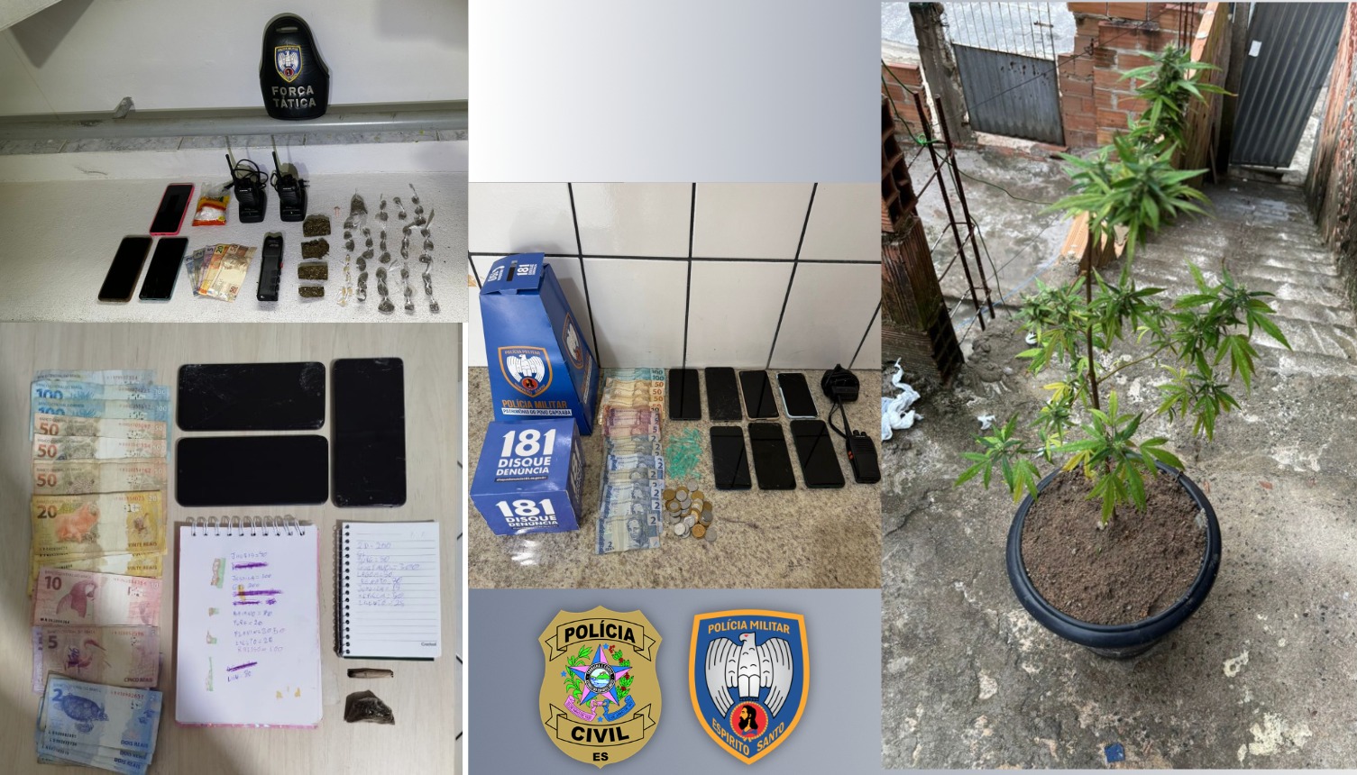 Conforme a Polícia Civil, o quarto conduzido à delegacia, de 20 anos, foi preso em flagrante pela prática dos crimes de tráfico de drogas e ameaça. O quinto preso, um jovem de 18 anos recém-completados, foi detido em flagrante pelo crime de tráfico de drogas. O sexto conduzido, um homem de 21 anos, foi levado à delegacia e autuado em flagrante pelo crime de tráfico de drogas.